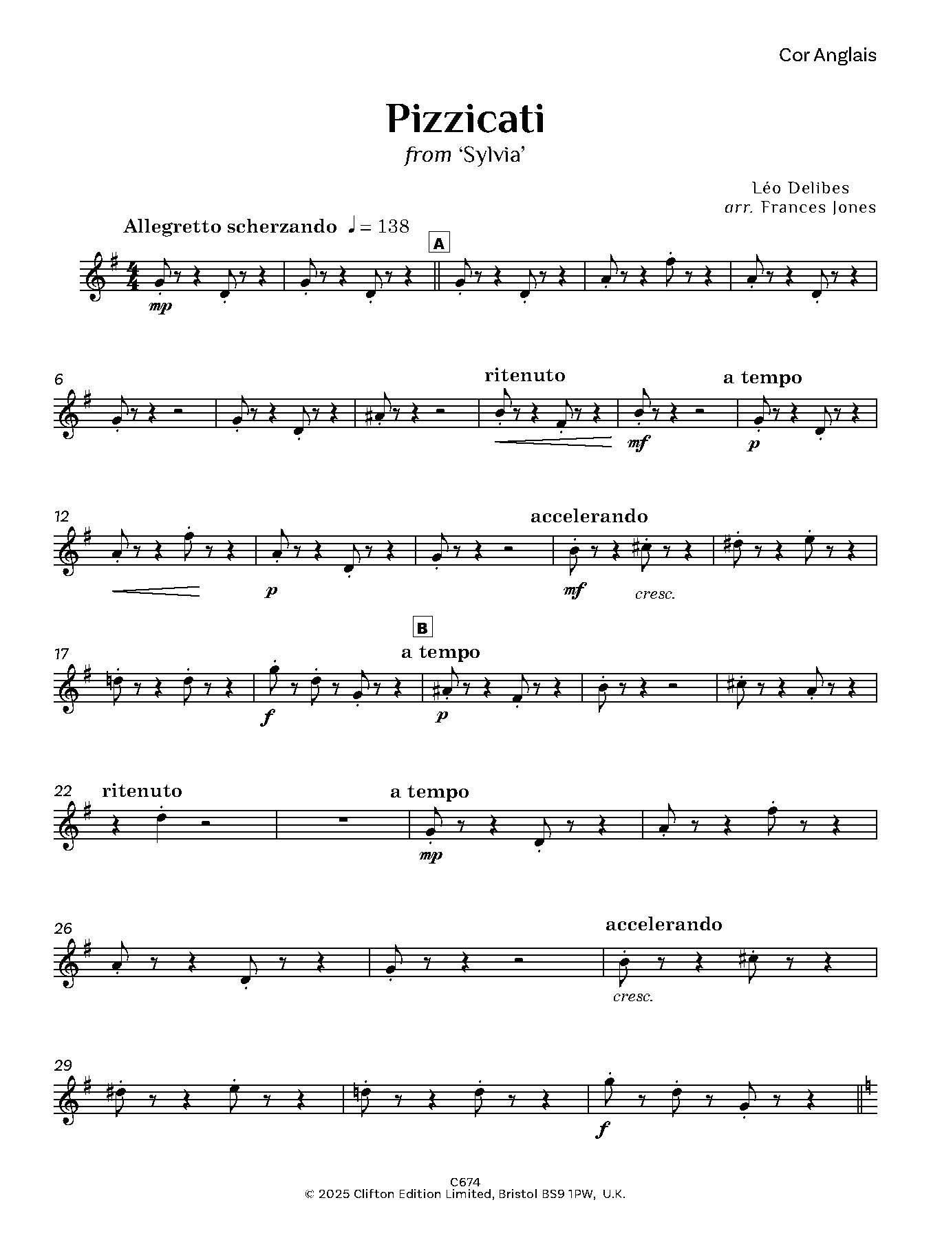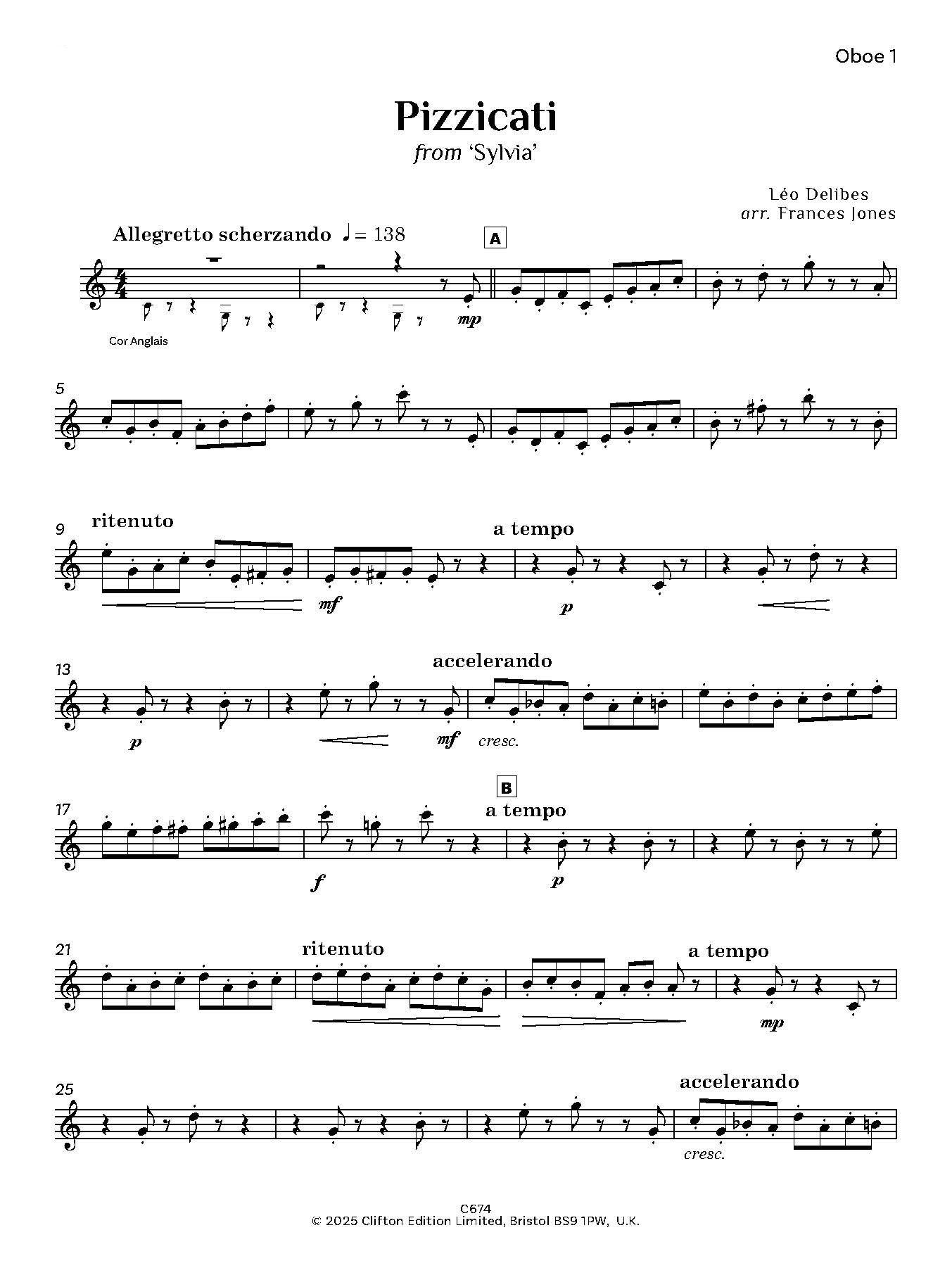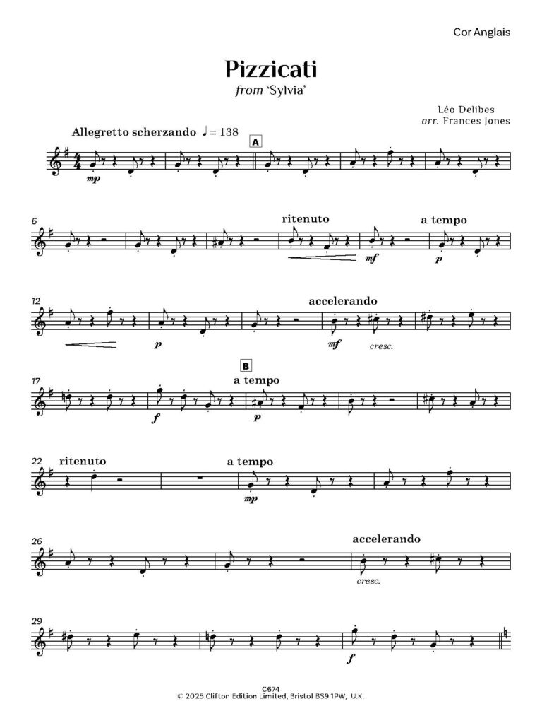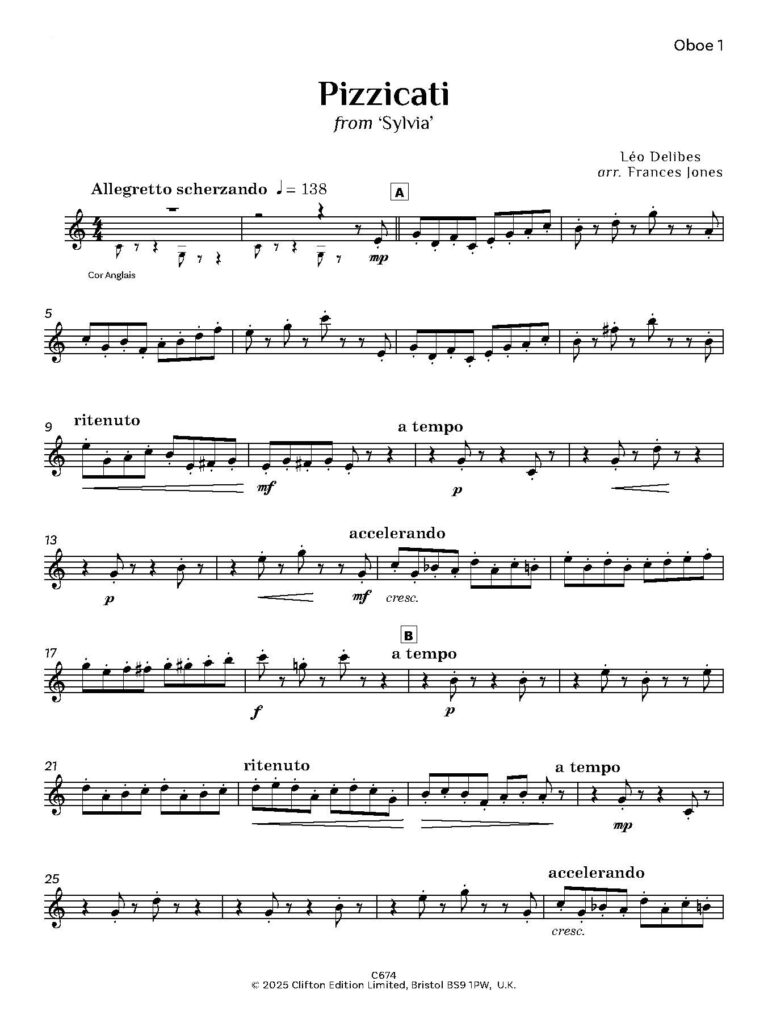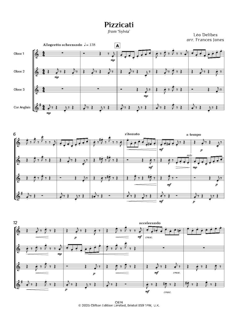Delibes composed many operatic works, both serious and light, incidental music, songs, a mass and a cantata, and also wrote music for a number of ballets, the best known being Coppélia, based on E.T.A. Hoffmann’s story Olympia. The music which Delibes wrote for the ballet Sylvia includes ‘Pizzicati’, a piece which will be instantly recognisable, and which has been arranged here by Frances Jones for a quartet of three oboes and cor anglais.