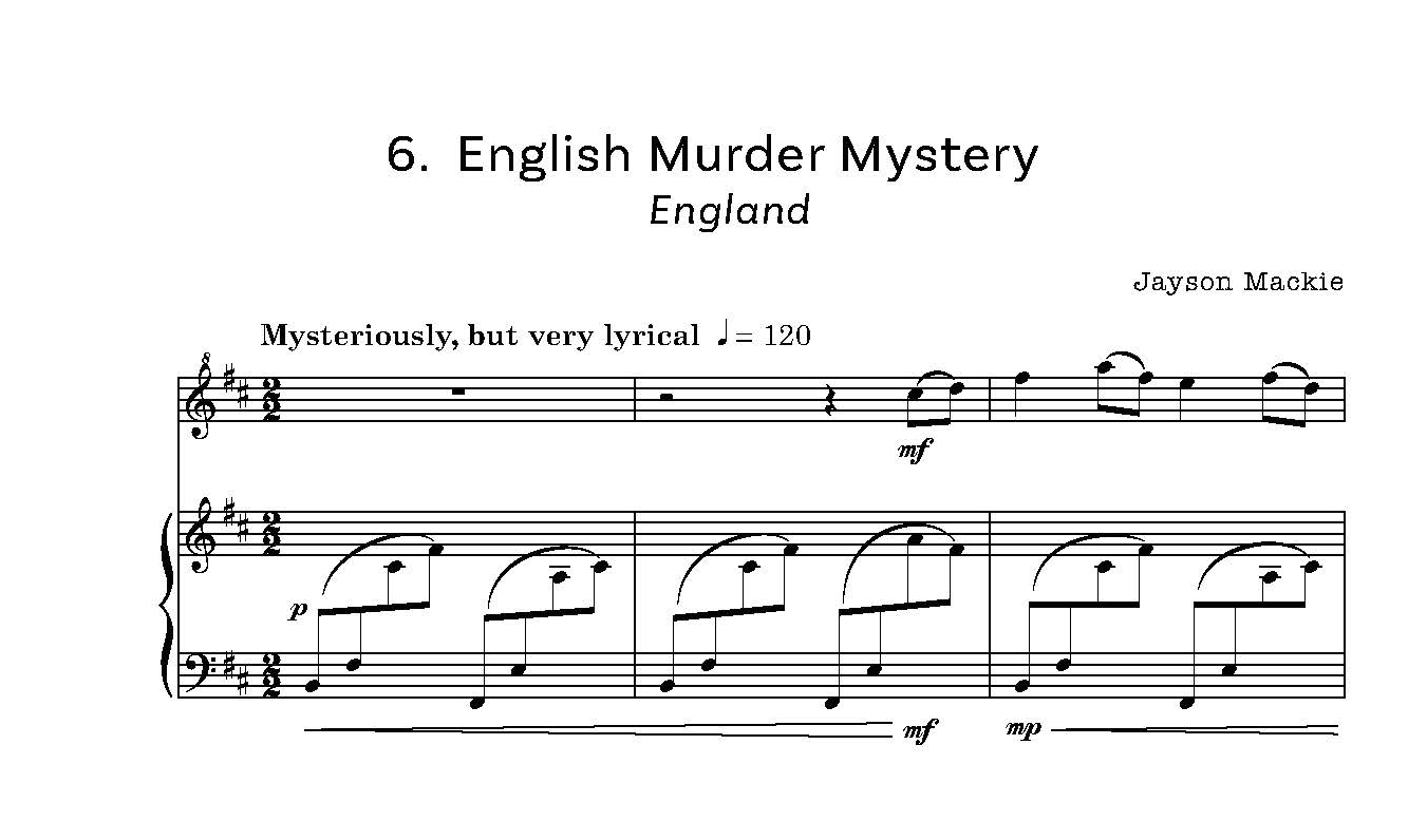 The ‘Japanese Lullaby’ is in 5/4 and is in Kumoi tuning, which is explained in the book. This is a ‘calm and easy-flowing’ composition. Then there is the ‘Romanian Folksong’ with its rocking middle section in 5/8 and 2/4. The penultimate piece is a ‘sultry’ Rumba, ‘Bahia Rumba’. The last work is the ‘English Murder Mystery’, which has many accidentals to negotiate.