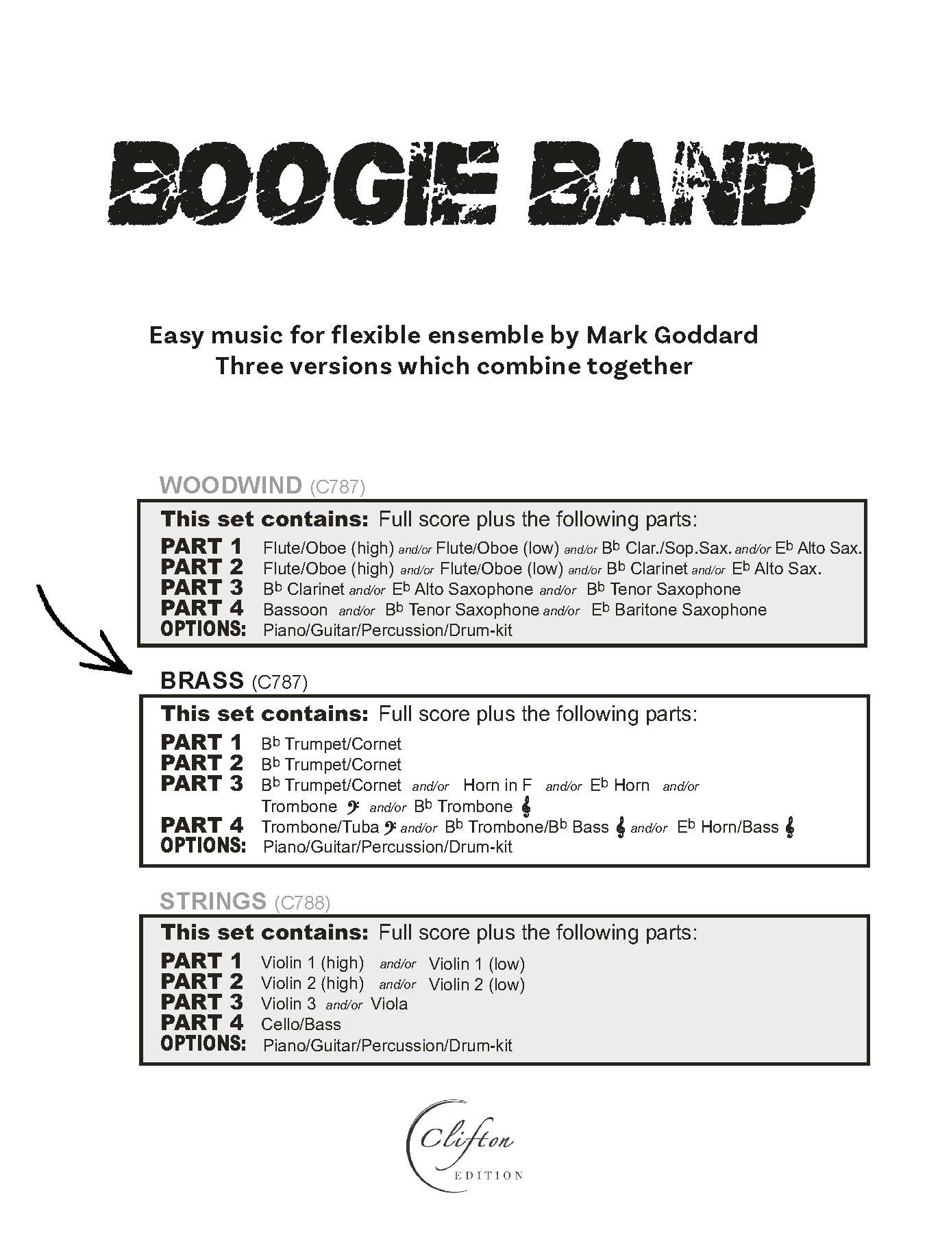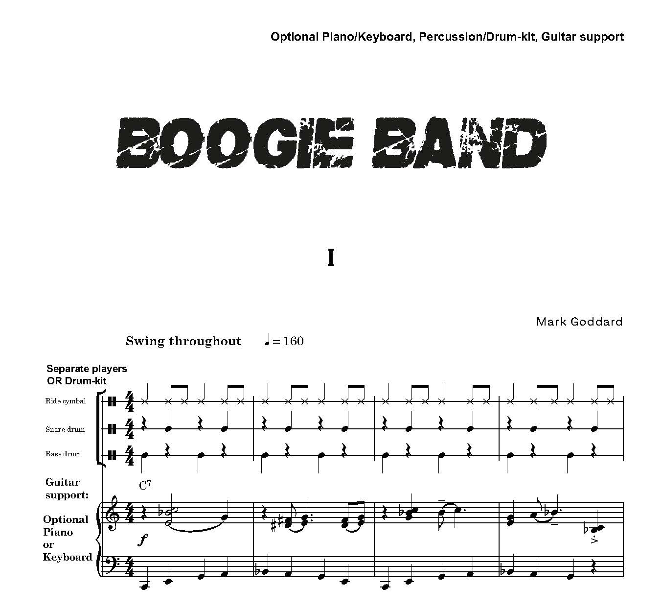 Boogie Band comprises 3 simple boogie based tunes — ideal for beginners — with optional drum-kit, percussion, keyboard and guitar chord symbols to enable flexible group music making, available in three packs that also fit together when required!