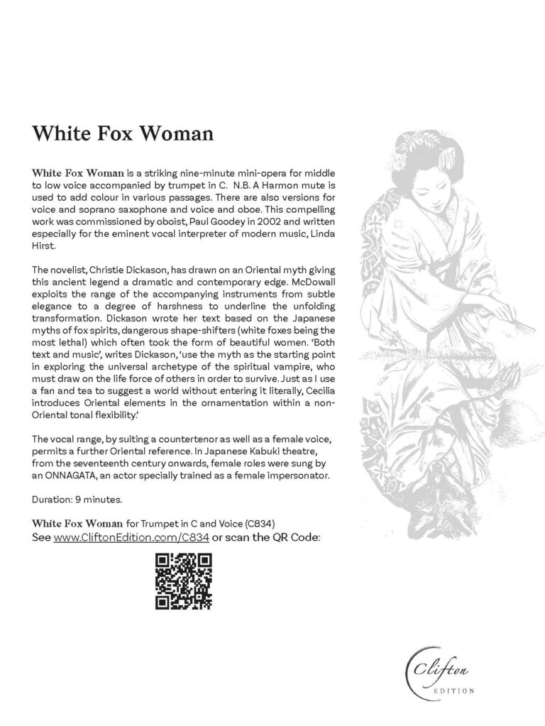The novelist, Christie Dickason, has drawn on an Oriental myth giving this ancient legend a dramatic and contemporary edge. McDowall exploits the range of the accompanying instruments from subtle elegance to a degree of harshness to underline the unfolding transformation. Dickason wrote her text based on the Japanese myths of fox spirits, dangerous shape-shifters (white foxes being the most lethal) which often took the form of beautiful women. ‘Both text and music’, writes Dickason, ‘use the myth as the starting point in exploring the universal archetype of the spiritual vampire, who must draw on the life force of others in order to survive. Just as I use a fan and tea to suggest a world without entering it literally, Cecilia introduces Oriental elements in the ornamentation within a non-Oriental tonal flexibility.’