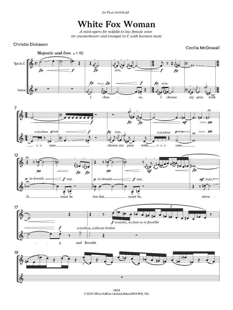 White Fox Woman is a striking nine-minute mini-opera for middle to low voice accompanied either by Soprano Saxophone or Oboe. This compelling work was commissioned by oboist, Paul Goodey in 2002 and written especially for the eminent vocal interpreter of modern music, Linda Hirst. McCowall has since created new versions for Soprano Saxophone and Voice and this version for Trumpet.