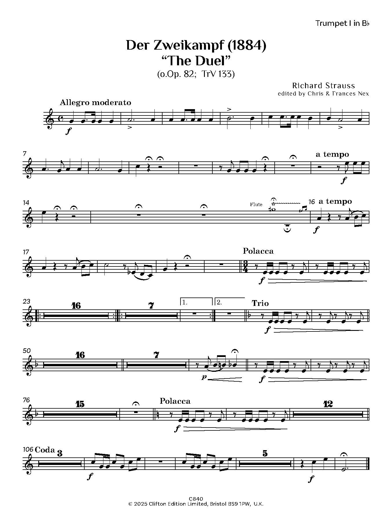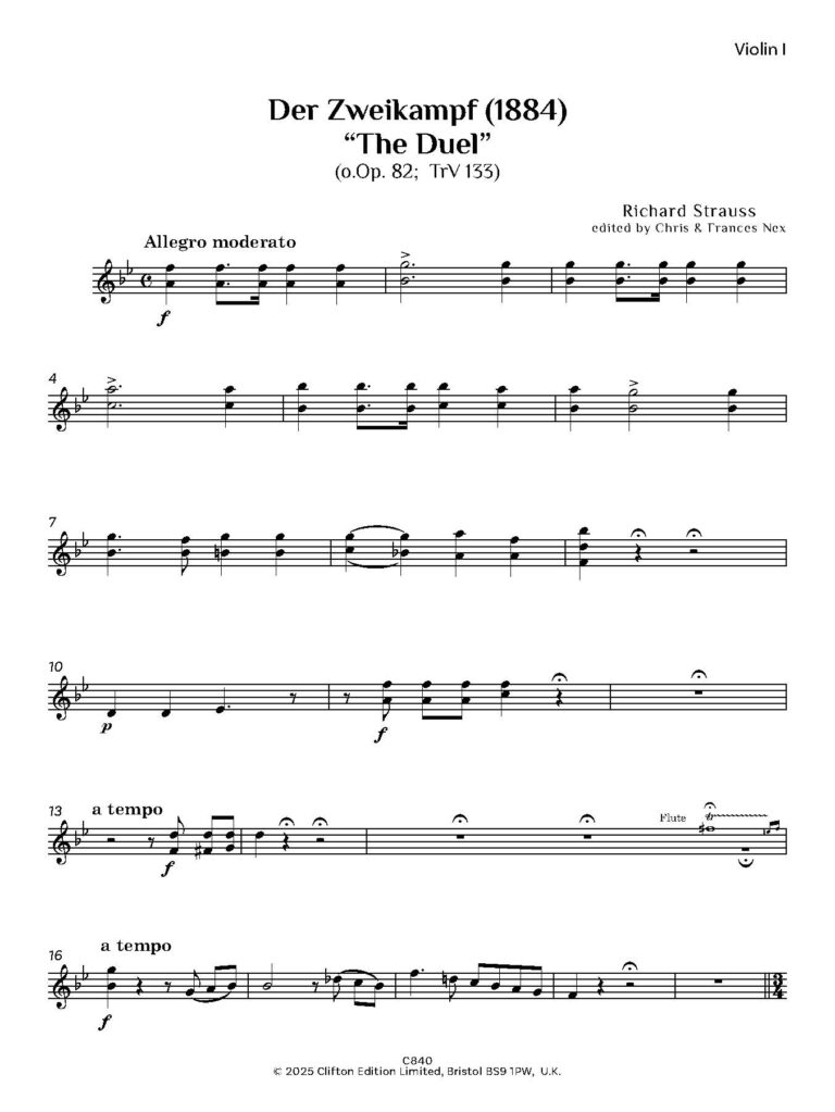 The score is dated 1930 and the bassoon part 1934. It is here entitled merely ‘duet for flute and bassoon with orchestra’, and ascribed to R. Strauss. We are also grateful for advice from Dr. Christian Wolf of the Richard Strauss Institut in Munich, who have access to a copy of ‘der Zweikampf’ made by Cl. Schubert, but the Richard Strauss Archiv in Garmisch-Partenkirchen will not permit them to make a complete copy for us, but has permitted sample pages to be copied, confirming the identity of the music. The work appears in Franz Trenner’s Richard Strauss – Werkverzeichnis (TrV 133), the definitive thematic catalogue of Richard Strauss’s works and is listed in the Richard Strauss Complete Edition (Richard-Strauss-Ausgabe), published by Schott Music, under Orchesterlieder (Balladen) – Der Zweikampf, TrV 133 and a manuscript and early printed materials are held under Richard Strauss’s name in the Bavarian State Library archives (Bayerische Staatsbibliothek).