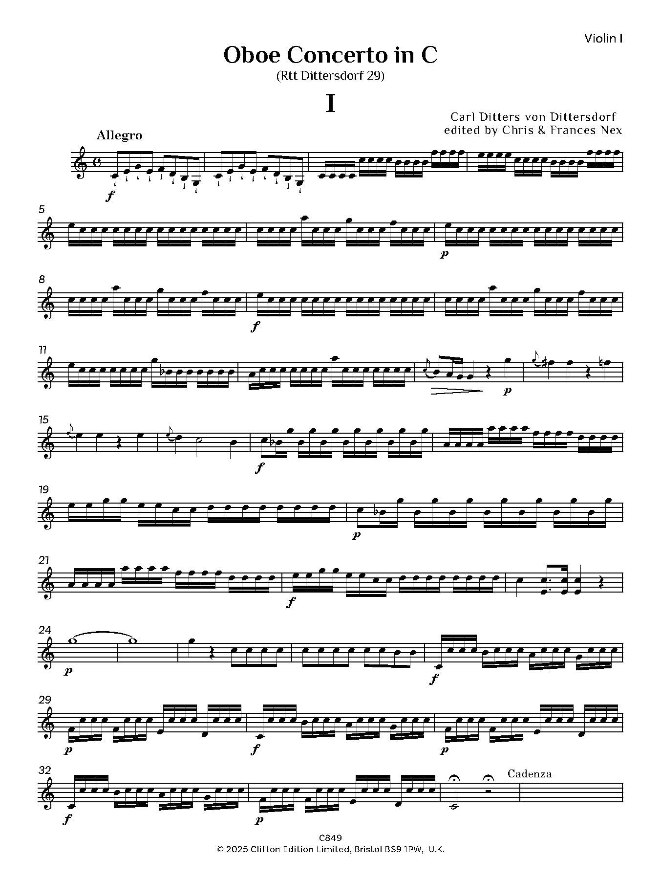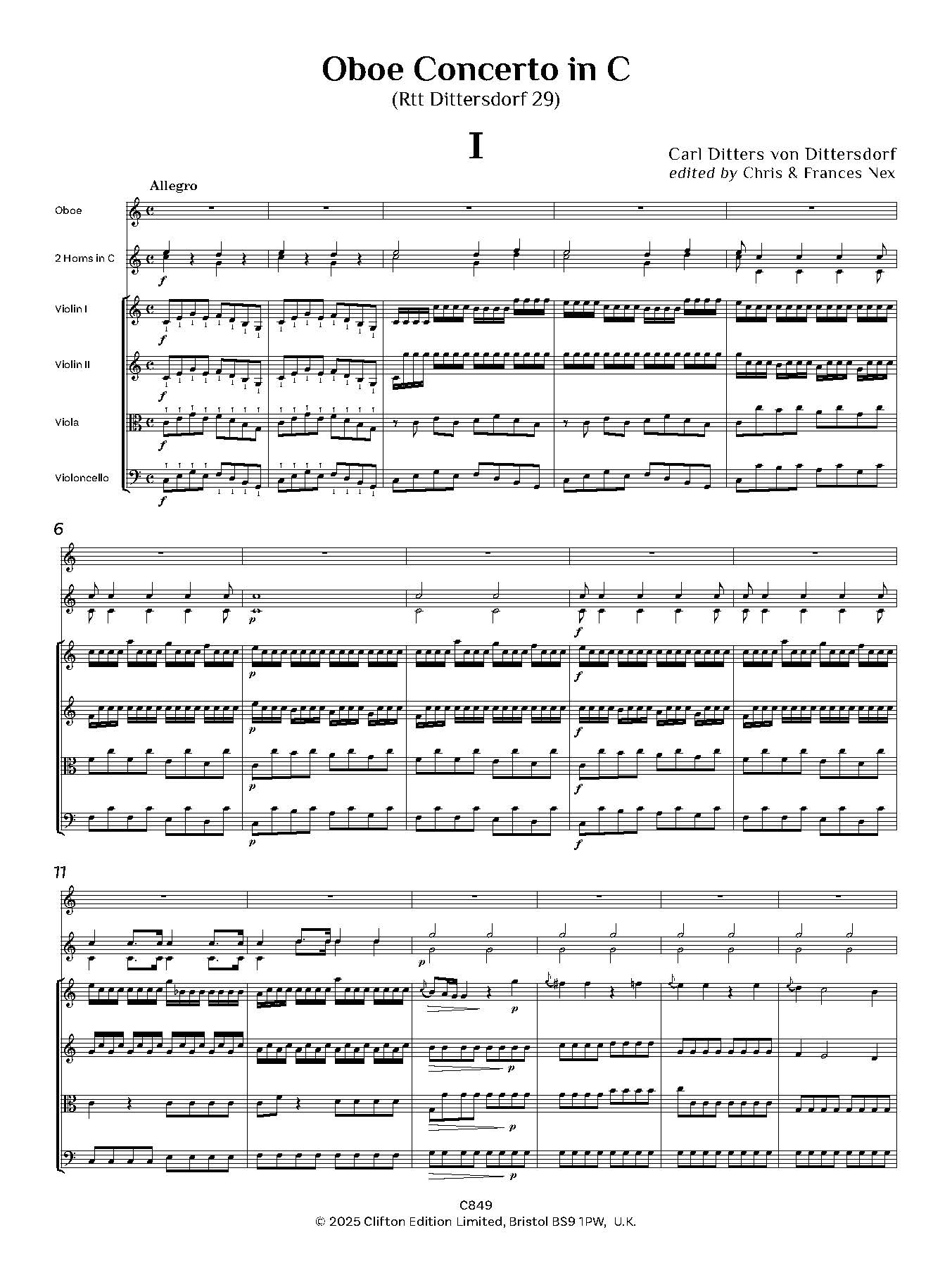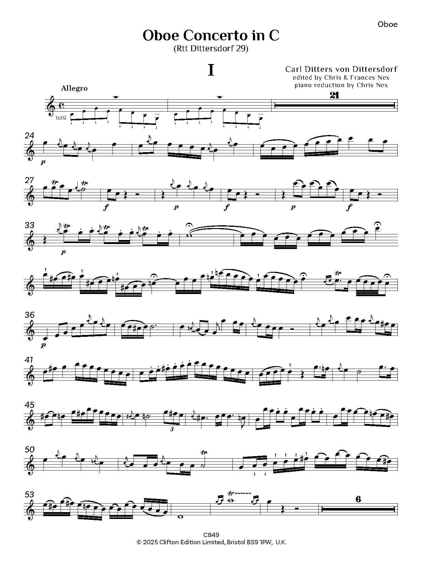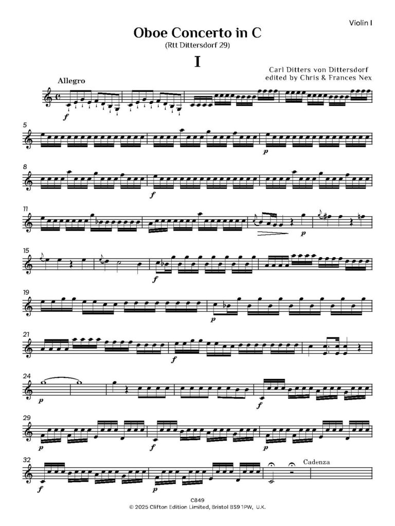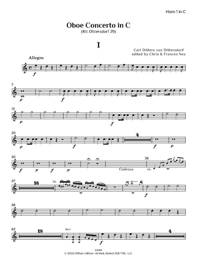 In addition to over 40 operas, von Dittersdorf wrote oratorios, masses and other church music, over 100 symphonies, divertimenti, chamber music and concerti. A number of Dittersdorf’s manuscripts are held in the Fürst Thurn und Taxis collection in Regensburg, among them two versions of a concerto for oboe d’amore, catalogued in Regensburg as Rtt Dittersdorf 34 and 35. The Regensburg collection also includes five oboe concertos, listed as Rtt Dittersdorf 29-33, three in C, one in G and one in D, and these are now published by Clifton Edition. An oboe concerto in G is available from Breitkopf and Härtel (5963) but is not the same as the concerto in G from Regensburg. According to Bruce Haynes (Music for Oboe 1650-1800, a bibliography, 2nd edition, 1992), the Breitkopf catalogue lists oboe concertos by Dittersdorf in C and in Bb published in 1775, but they are not currently available, nor is the oboe concerto in C published by Simrock. It is therefore difficult to ascertain whether either of these concerti in C matches any of those from Regensburg (Rtt Dittersdorf 29, 31 and 32). The current editions, together with the piano reductions, have been prepared for publication with the permission of the Fürst Thurn und Taxis Zentralarchiv und Hofbibliothek in Regensburg and edited by C.M.M. Nex and F.H. Nex.