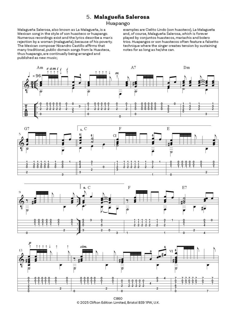 The Essential Latin Collection for Guitar contains Latin songs and dances which, in the main, have become international “standards”. During the 20th century, much music from the Latin Americas was re-discovered and often re-produced with newly created titles and lyrics. The arrangements here are all based on the original traditional ideas and have become, thereby, new music for the guitar. The universal popularity of the pieces allows them to be played in almost any setting. They can serve for both study and solo performance, and the different styles and moods of the music make the collection a valuable and enjoyable addition to the guitar repertoire.