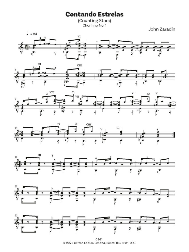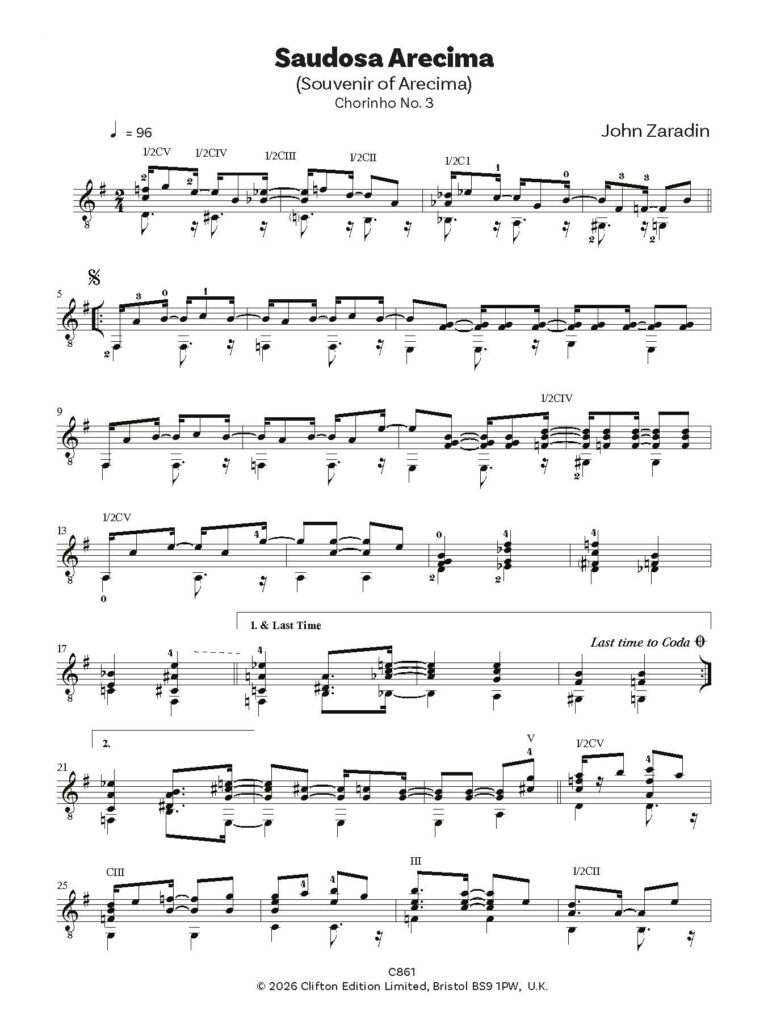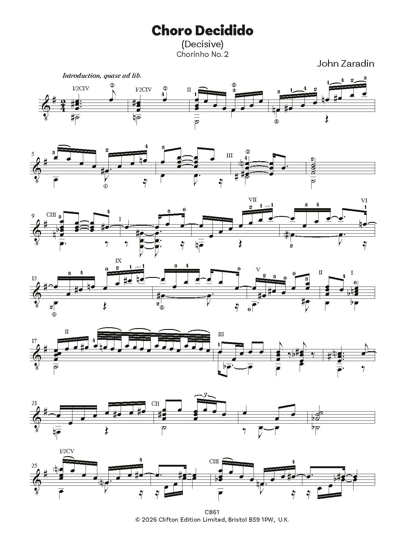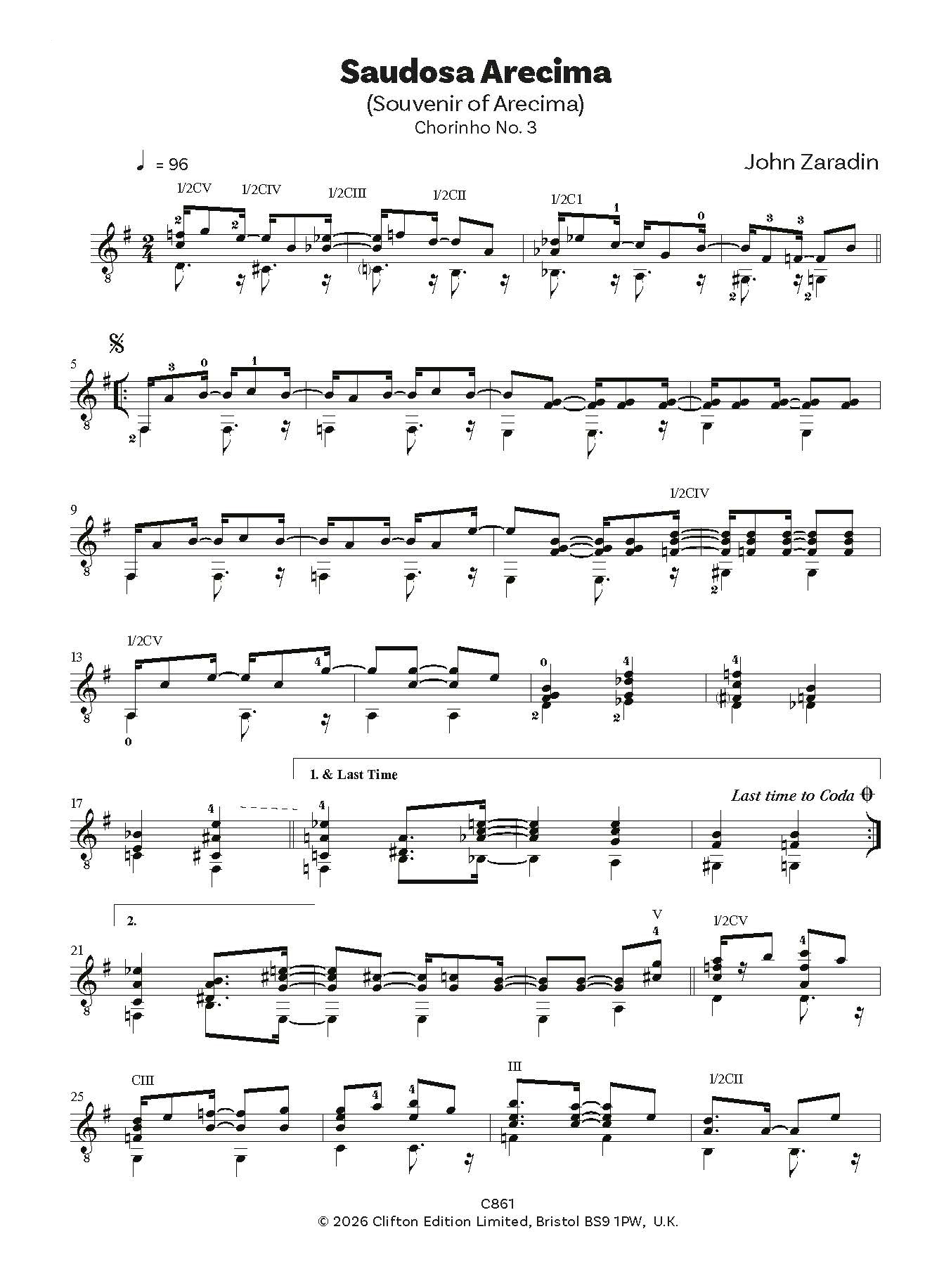 Although the melodic, harmonic and rhythmic content of the Choros/Chorinho has evolved greatly over time its underlying beat feel is traditionally 2 per measure and written with a 2/4 time signature. This generally makes comfortable reading for the guitar player, because the beamed note groupings define clearly the rhythm patterns to be played. However, much music that originally appeared in 2/4 time is now published in 4/4, with a cut time feel, and which seems to be favoured by many musicians, including guitarists, who work in folk and popular idioms. For this edition the time signature which allows a clearer page presentation is chosen for each piece and no musical difference between the 2/4 and the Cut-time signatures is intended.