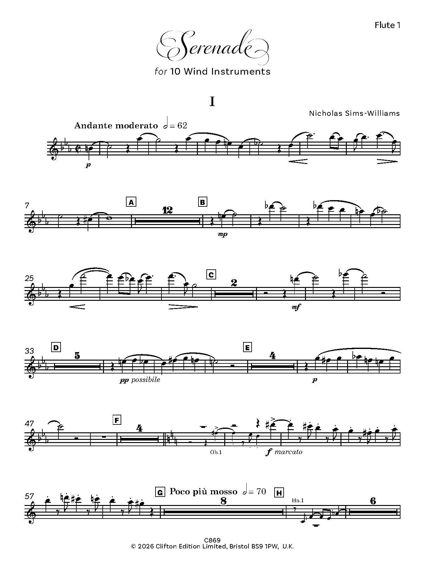 Many of Nicholas Sims-Williams’ compositions are for wind instruments. He is himself a horn-player, and married to an oboist. This Serenade is a substantial piece lasting about 18 minutes. It is scored for 2 flutes, 2 oboes, 2 clarinets, 2 horns and 2 bassoons, with the second flute doubling on piccolo, the second oboe doubling on cor anglais (in the first movement only), and the second clarinet doubling on bass clarinet (in the last movement). If a bass clarinet is not available, the second clarinet should play the alternative part for clarinet in A see separate part. Other instruments should play the bass clarinet cues printed in their parts.
