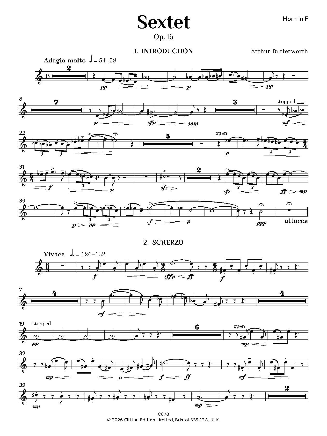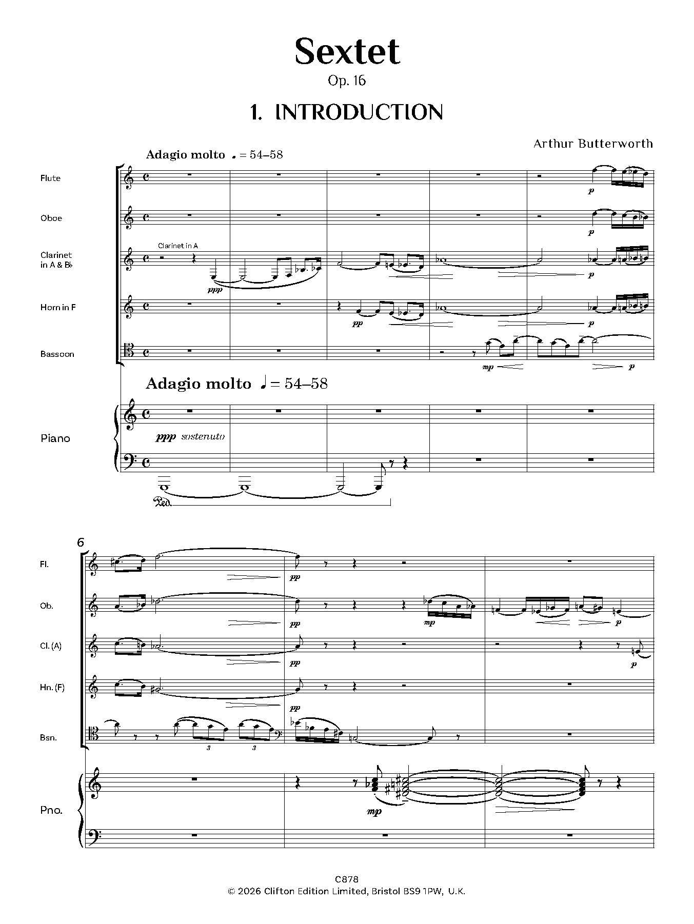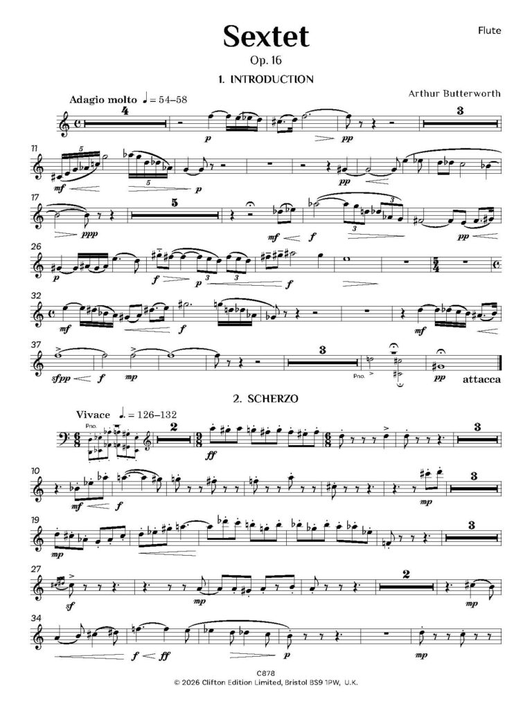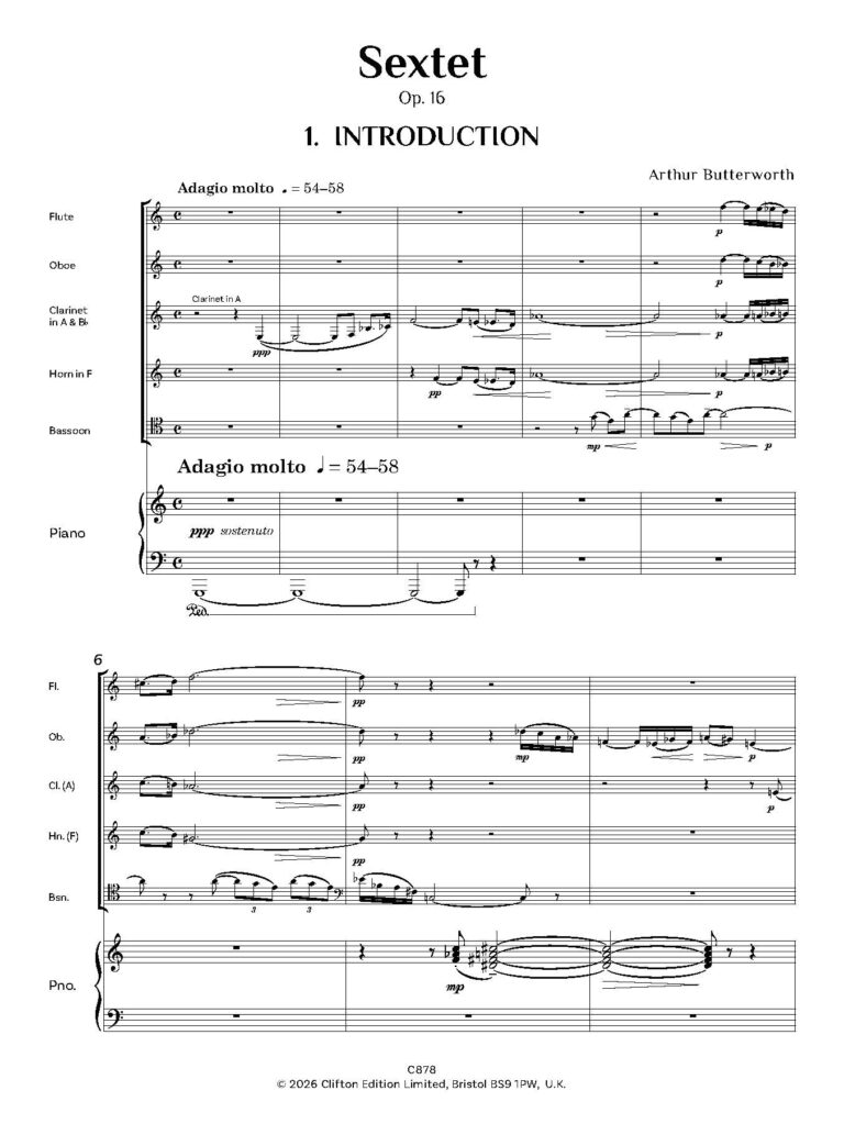 Arthur Butterworth’s Sextet, Op. 16 is scored for Flute, Oboe, Clarinet in Bb and A, Horn in F, Bassoon and Piano.