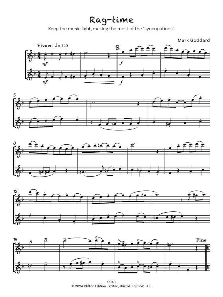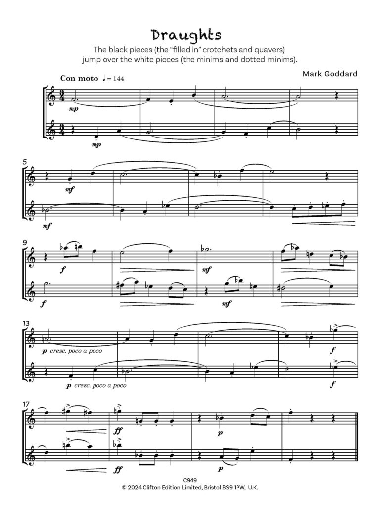 “Tricks and Games” comprises a series of short and contrasting pieces, in a light, yet essentially modern idiom. Parts are intended to be played by two pupils of similar abilities, rather than by teacher and pupil, with the aim of public rather than private performance.