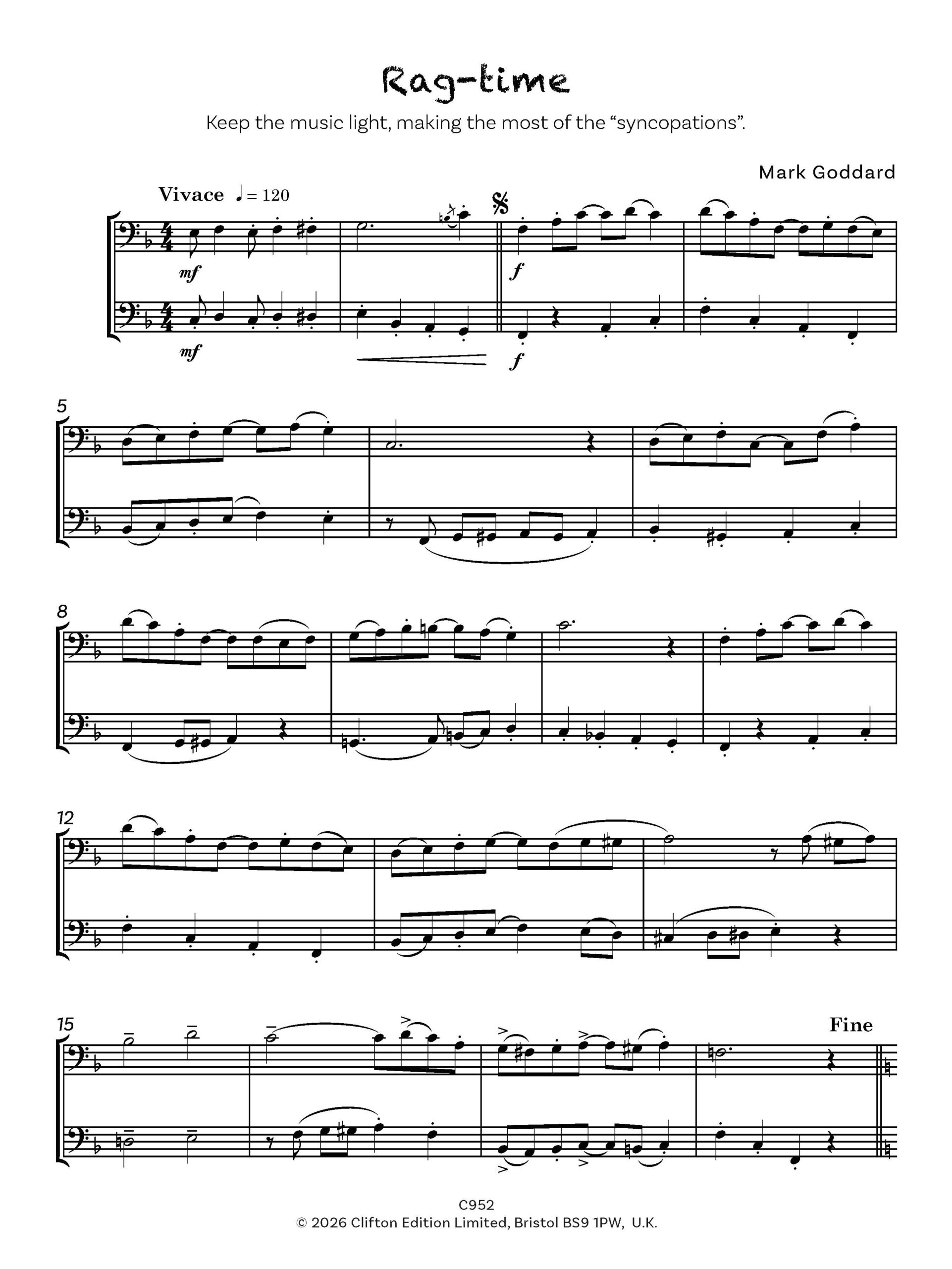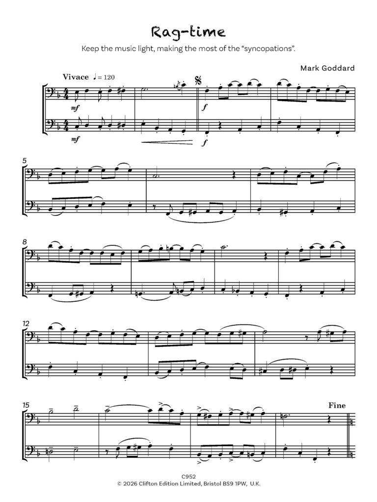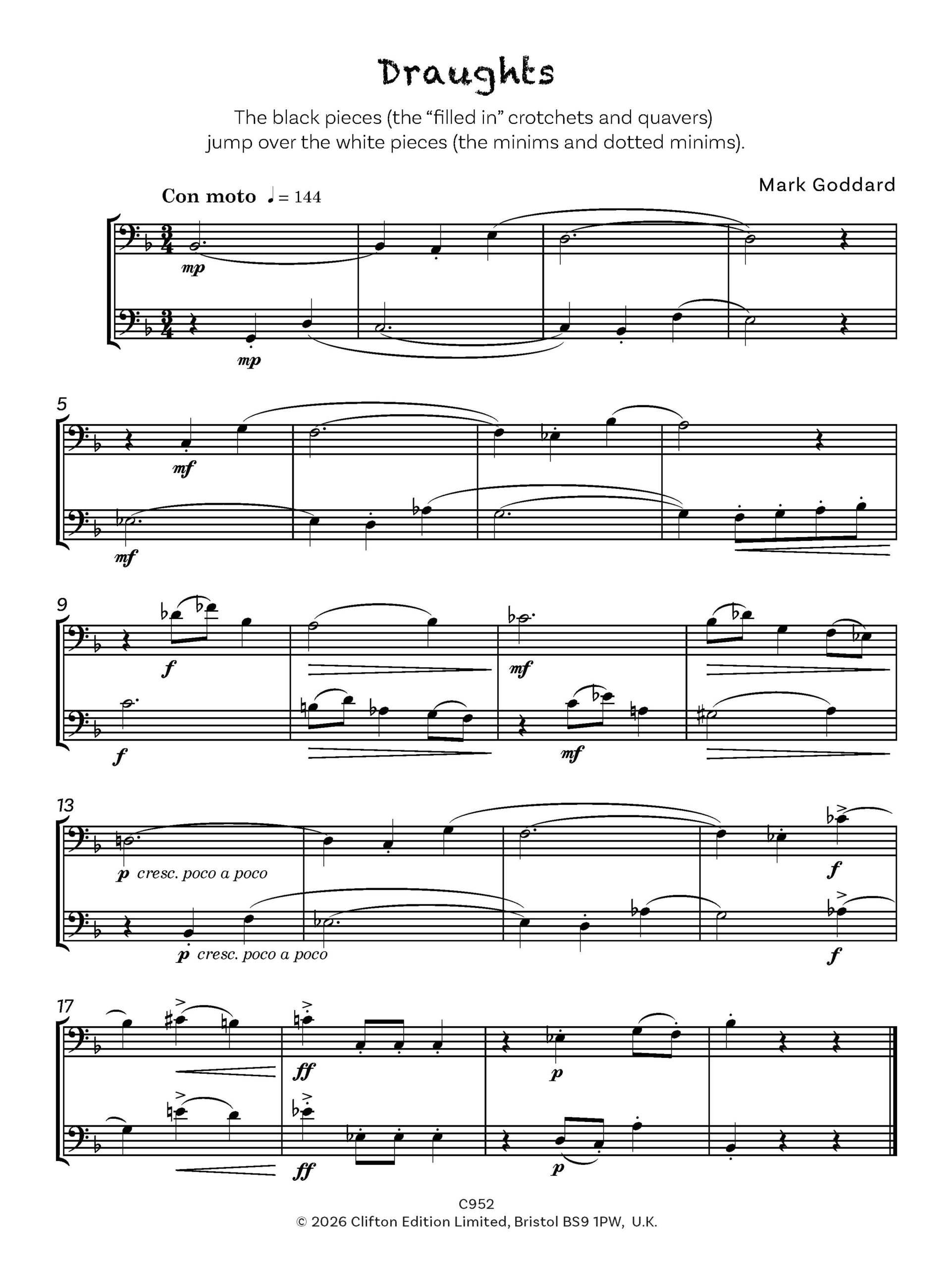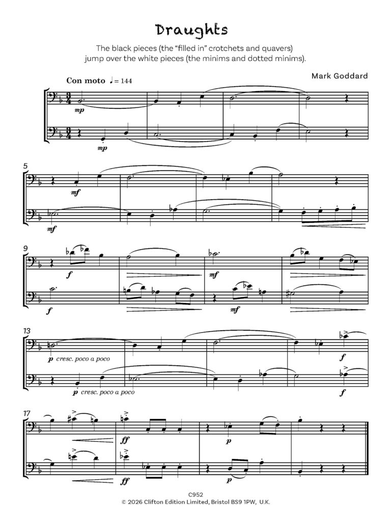 “Tricks and Games” comprises a series of short and contrasting pieces, in a light, yet essentially modern idiom. Parts are intended to be played by two pupils of similar abilities, rather than by teacher and pupil, with the aim of public rather than private performance.