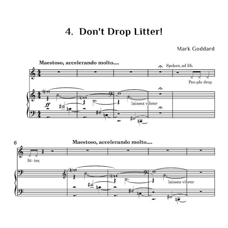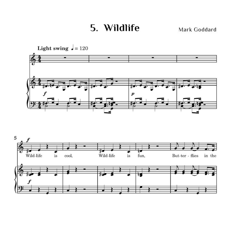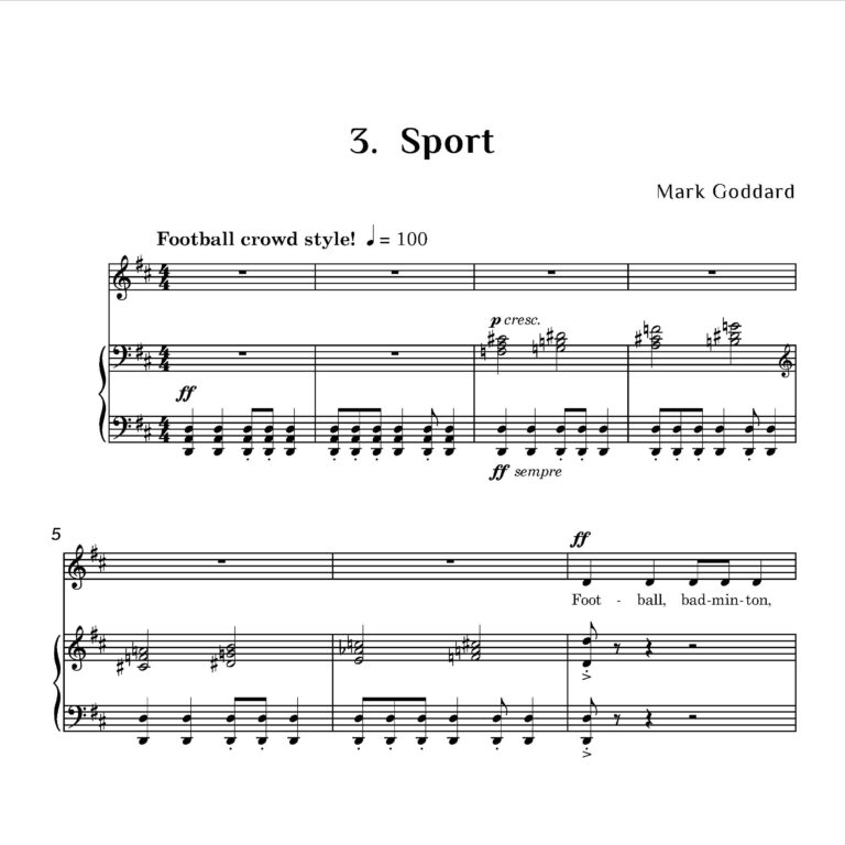 For the Highland Year of Culture in 2007, Gergask Primary School at Laggan Bridge organised a poetry competition, from which six poems were selected for composer Mark Goddard to set. Gergask School is situated in the beautiful and remote Scottish Highlands, within the Cairngorms National Park, and the themes of the poems reflect the pupils’ unique surroundings and deep environmental awareness. The local sport is the beloved ‘shinty’, and the children take great pride in their award-winning public loo, whose interior is adorned with murals painted by the village’s children.