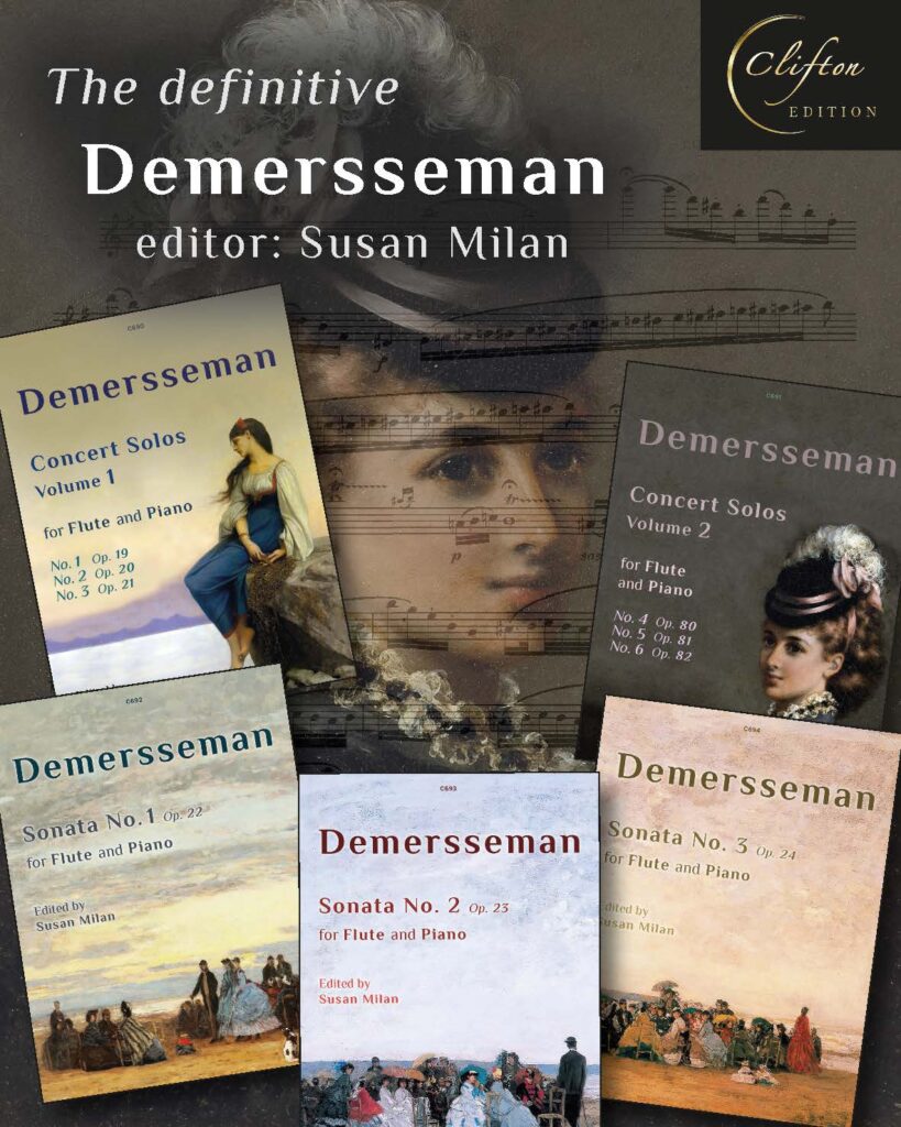Just published: Susan Milan’s definitive series: the complete Jules Demersseman Concert Solos and Sonatas for Flute and Piano. Beautiful new typesetting and stunning new covers, with scholarly editing by one of the UK’s leading flute experts.